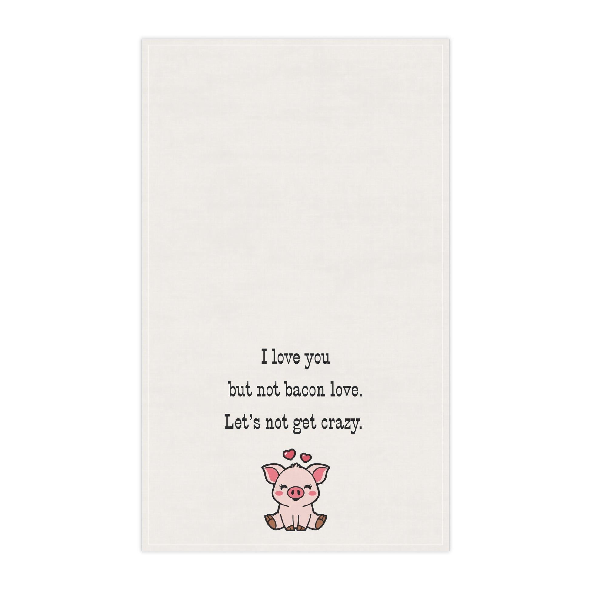 Meat Lovers Unite! "I love you, but not Bacon love. Let's not get crazy." Brighten up your kitchen with this humorous tea towel that celebrates bacon. Our towels bring a splash of fun and personality to any kitchen. Made for anyone who loves to cook or bake, these towels are perfect for casual gatherings, holiday parties, or everyday use. Whether you're celebrating a birthday, hosting a family dinner, or simply enjoying a cozy evening at home, these tea towels are both stylish and functional. Their charming designs make them a wonderful gift idea for friends or family who appreciate a touch of country flair.