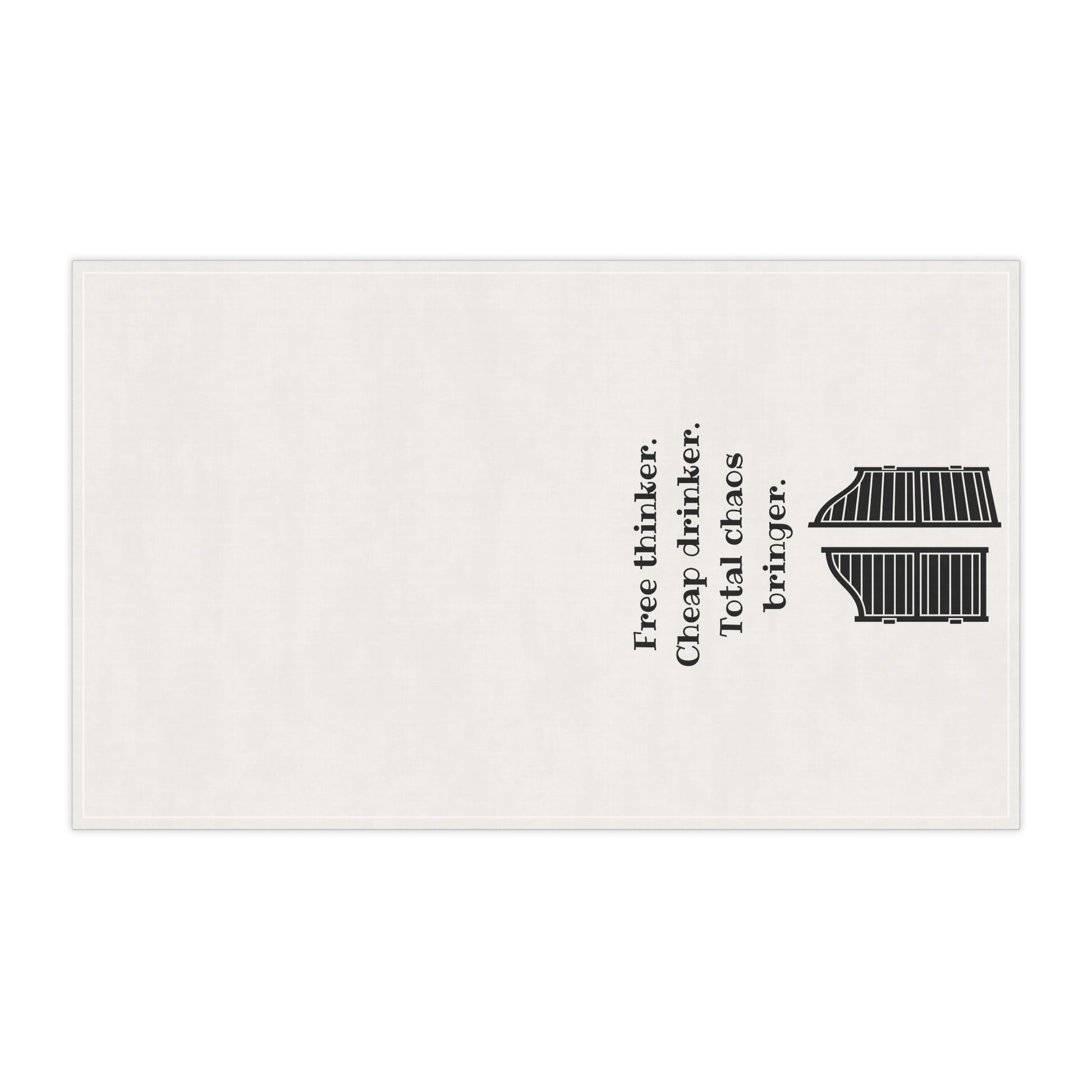 Unleash your inner renegade with our "Free Thinker, Cheap Drinker, Total Chaos Bringer" dish towel! This 18” x 30” cotton compadre is tougher than a two-dollar steak and ready to tackle kitchen messes with a wink and a nod. Perfect for mopping up spills, drying dishes, or just slingin’ over your shoulder while you sip that budget brew and stir the pot—literally and figuratively. With its bold, in-your-face mantra, this towel’s for folks who think for themselves, drink what’s on sale, and ain’t afraid to kick up a little chaos. Ideal for the cowboy, the contrarian, or anyone who’d rather guzzle than grovel. Grab this dish towel and let the good times (and the dishes) roll!