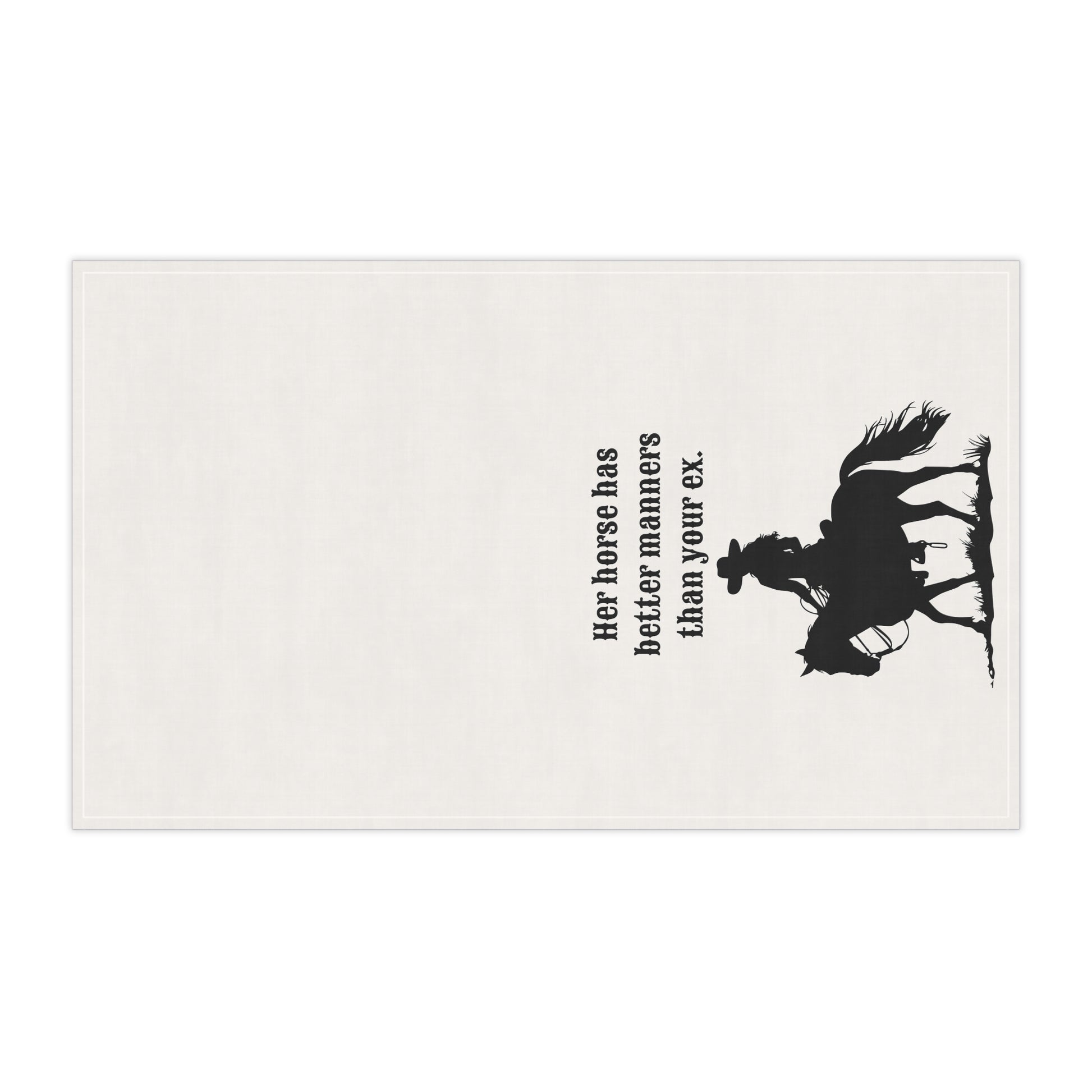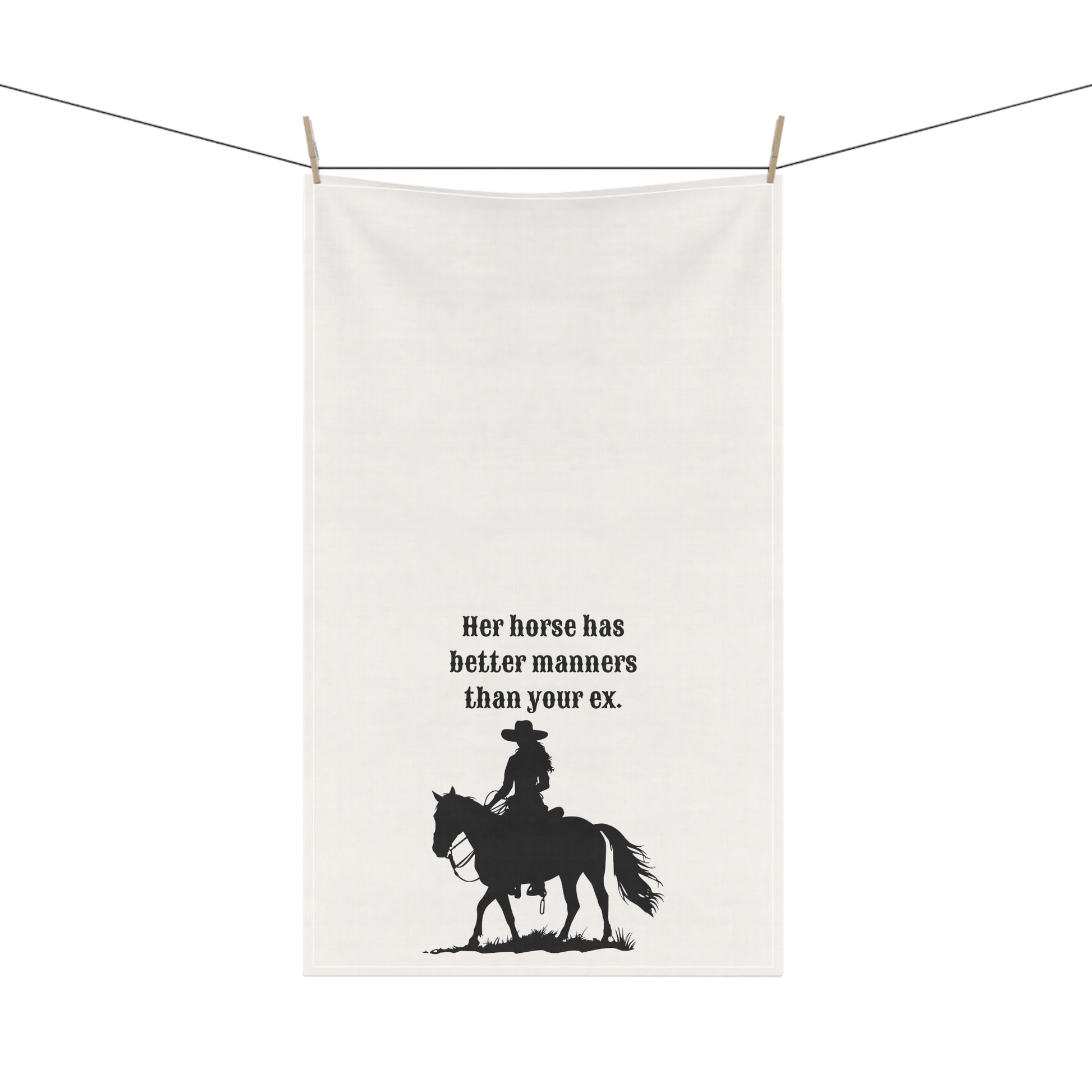 Funny Horse Tea Towel, "Her Horse has better manners than your ex" Sassy tea towel to spice up your Kitchen or Bar Decor, Horse Lover Gift, Housewarming Gift