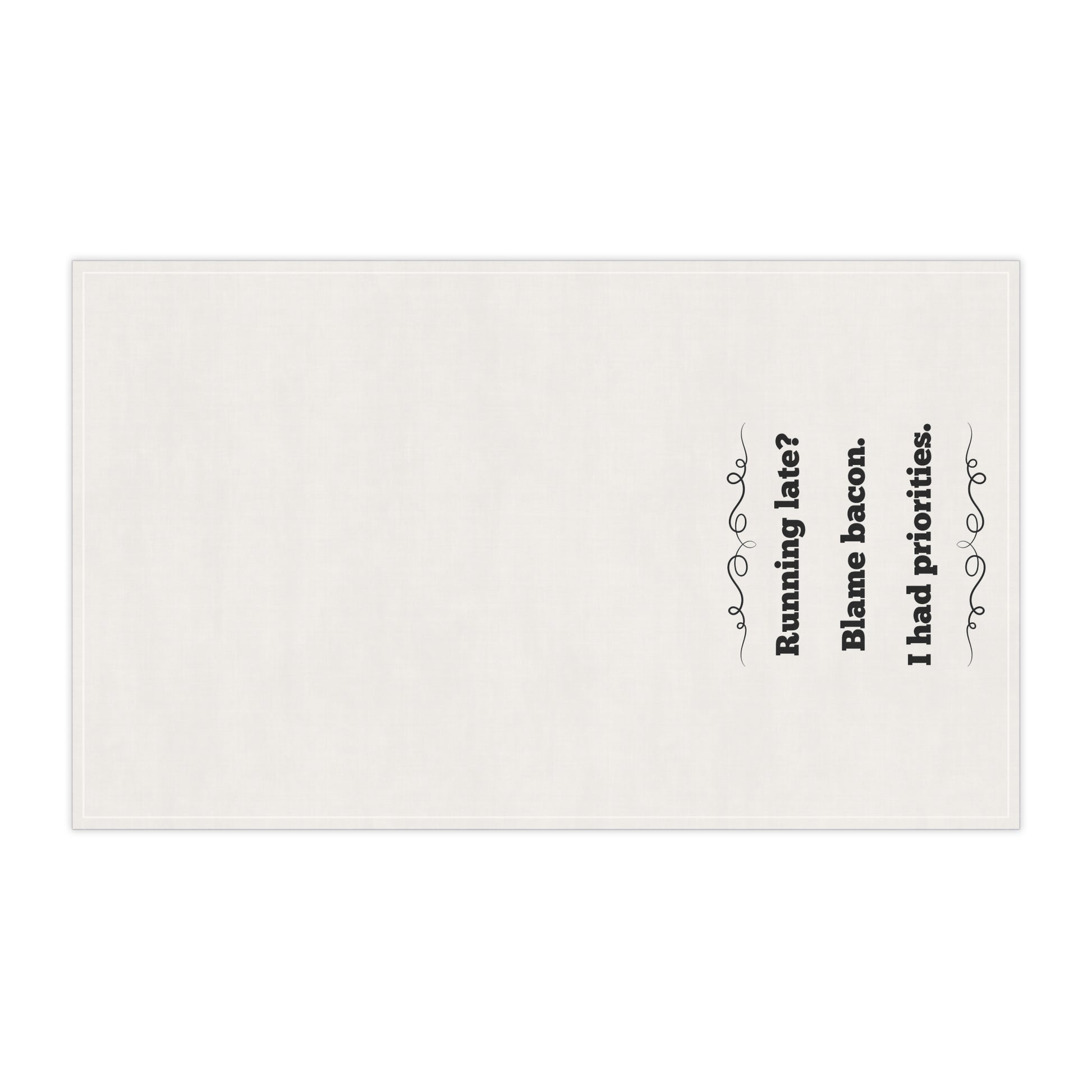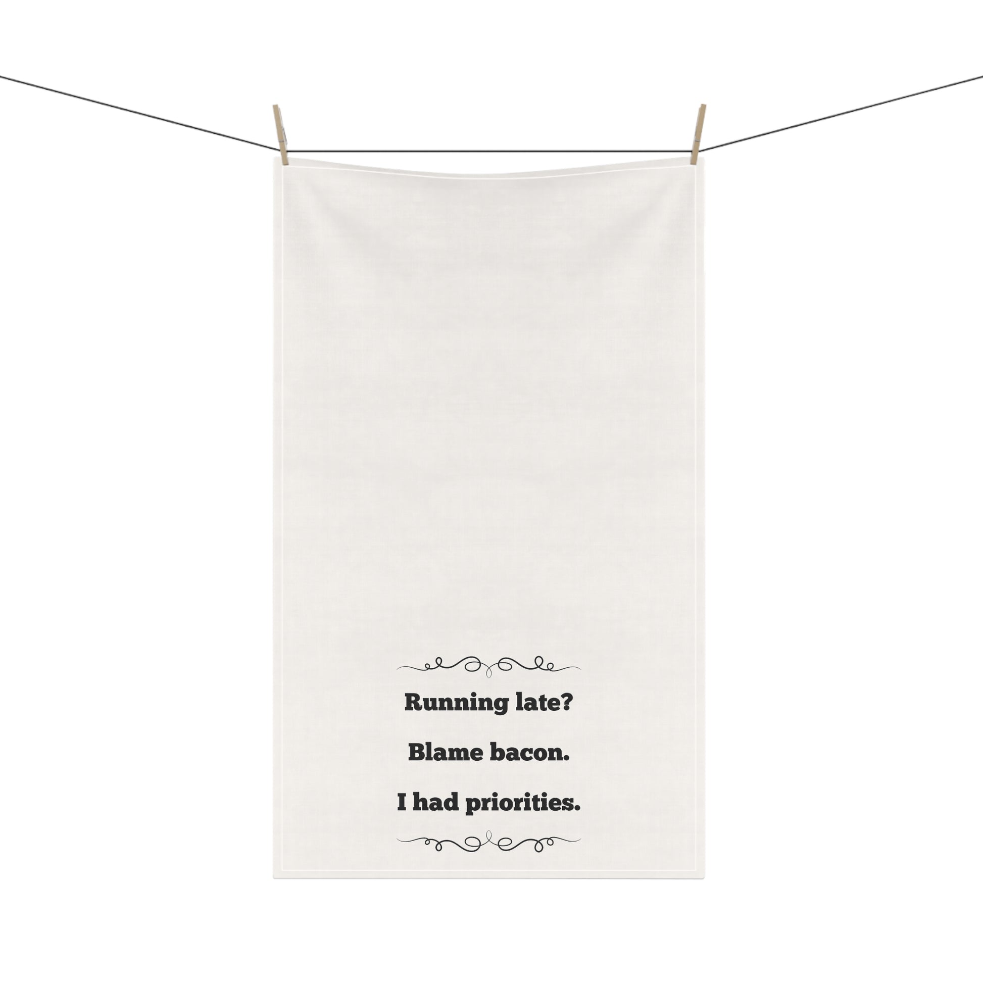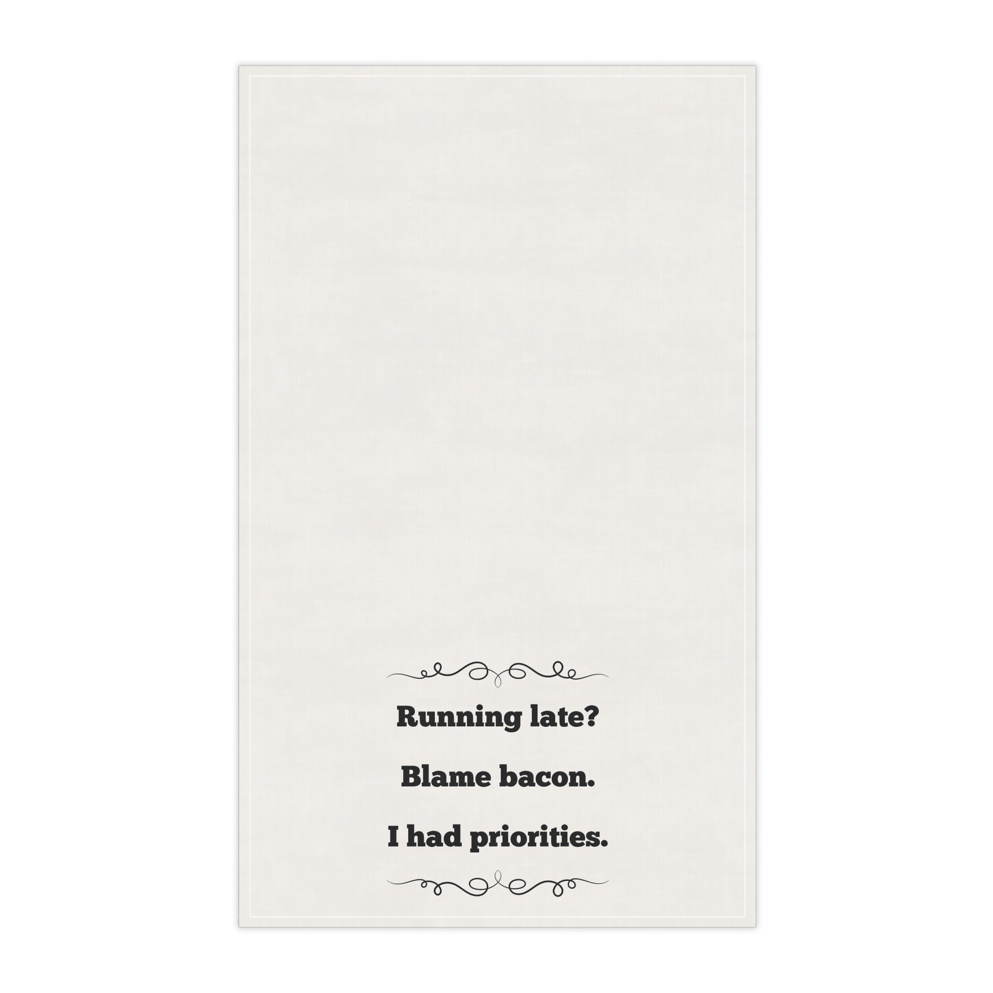 Show Off your love of bacon! "Running Late? Blame Bacon. I had priorities" Brighten up your kitchen with this humorous tea towel that celebrates bacon. Our towels a splash of fun and personality to any kitchen. Made for anyone who loves to cook or bake, these towels are perfect for casual gatherings, holiday parties, or everyday use. Whether you're celebrating a birthday, hosting a family dinner, or simply enjoying a cozy evening at home, these tea towels are both stylish and functional. Their charming designs make them a wonderful gift idea for friends or family who appreciate a touch of country flair.