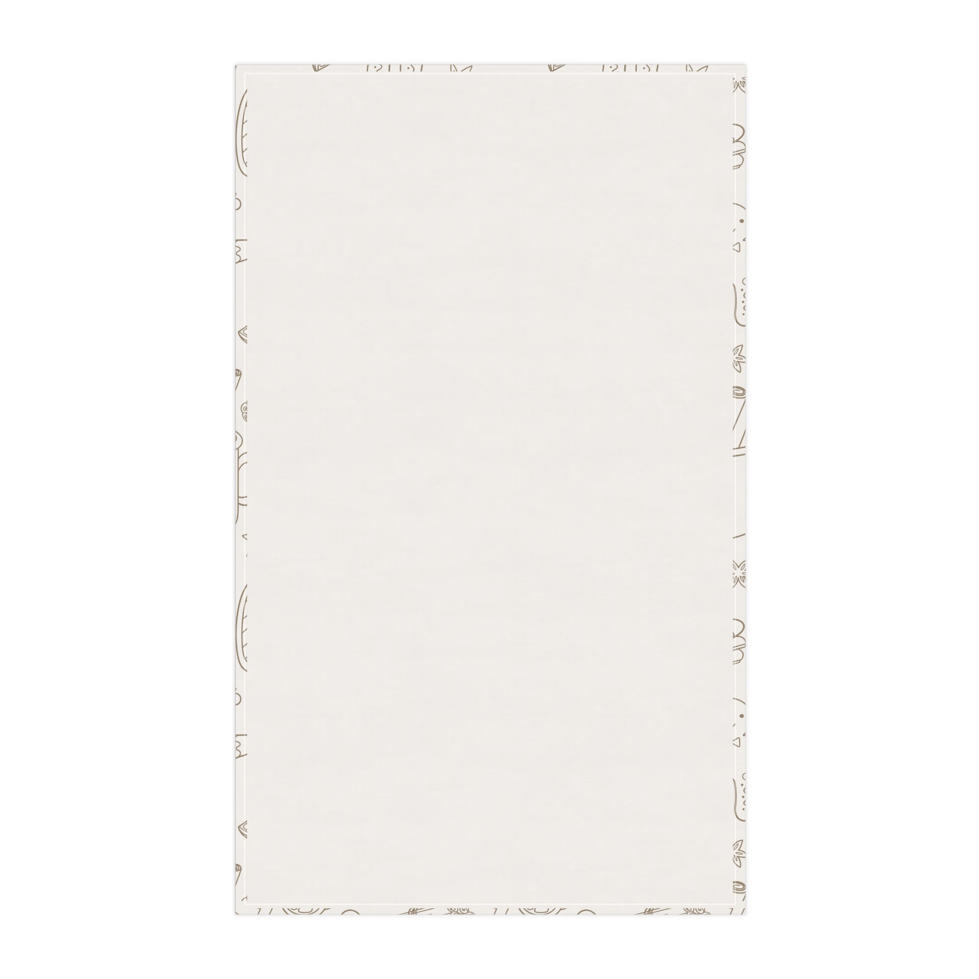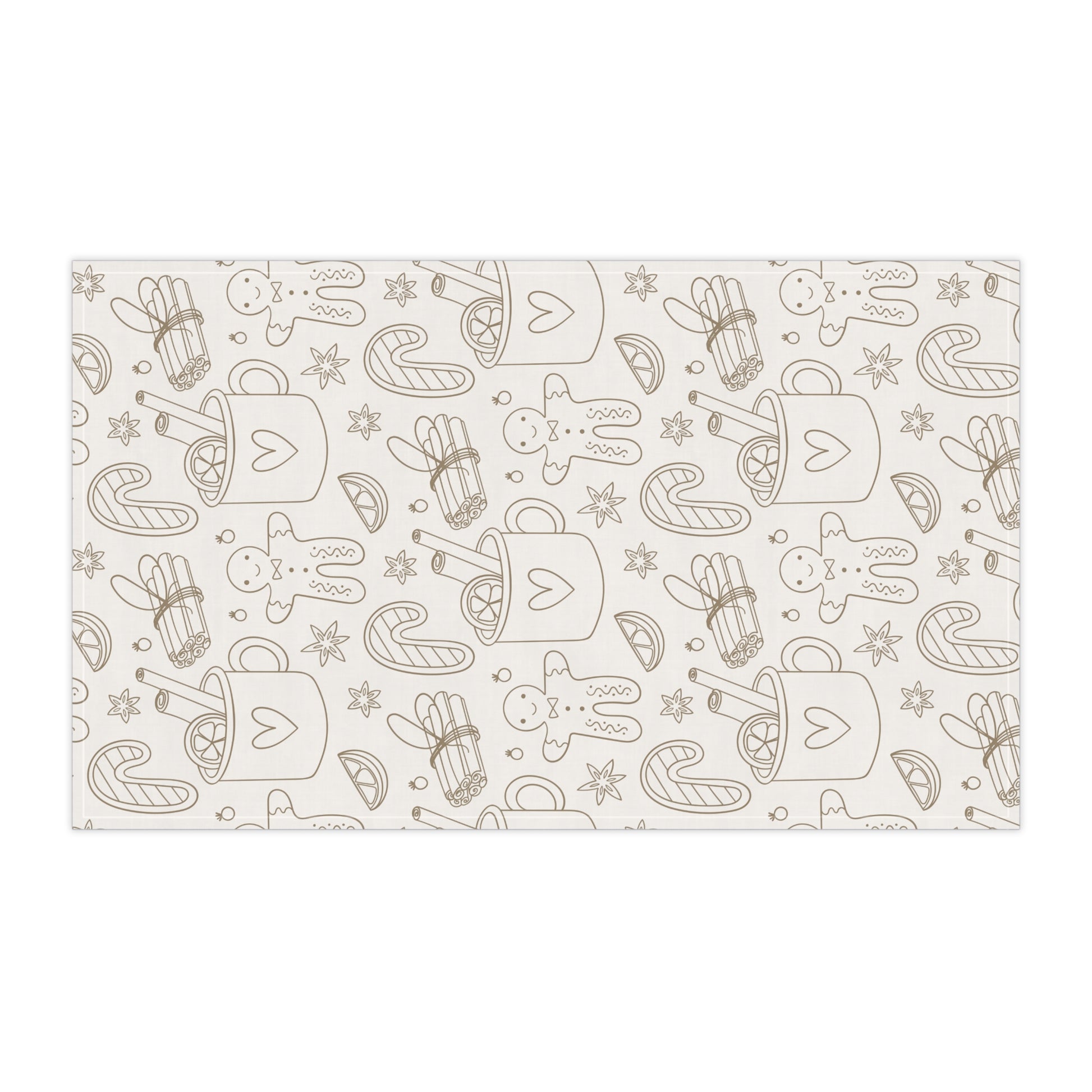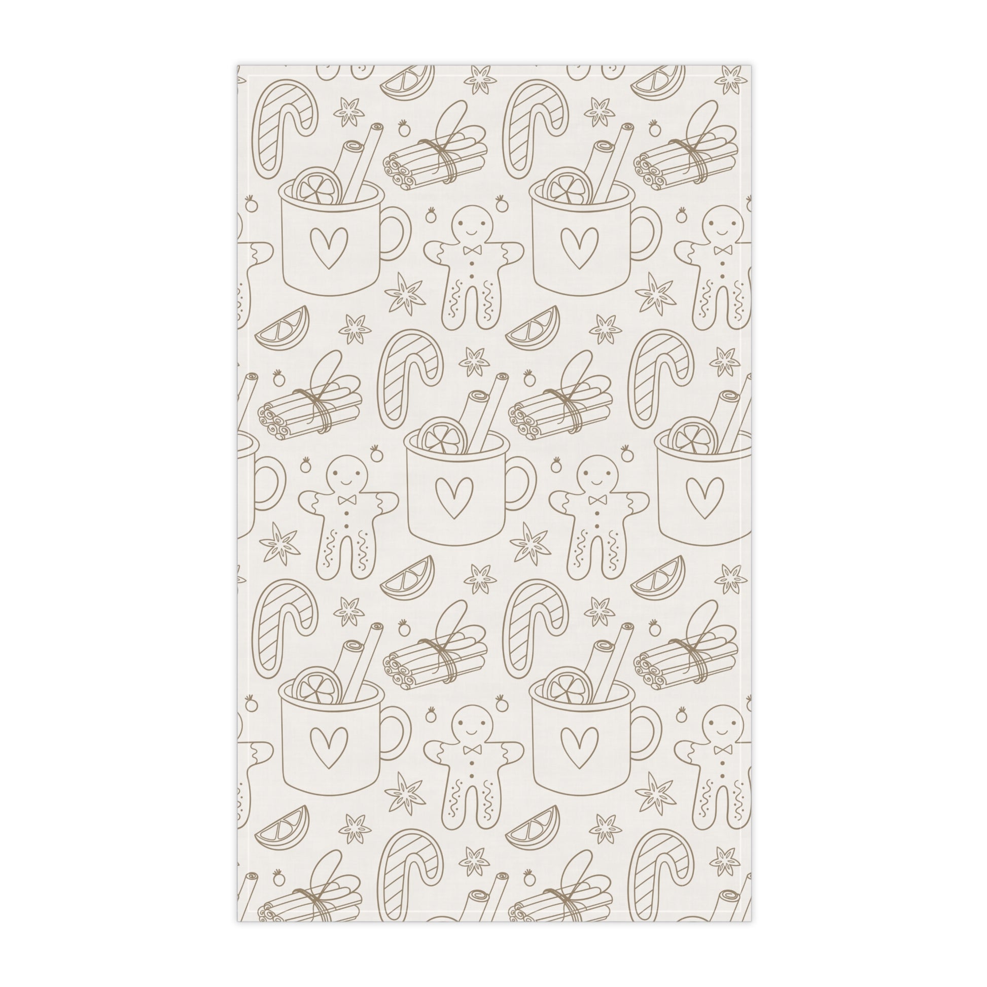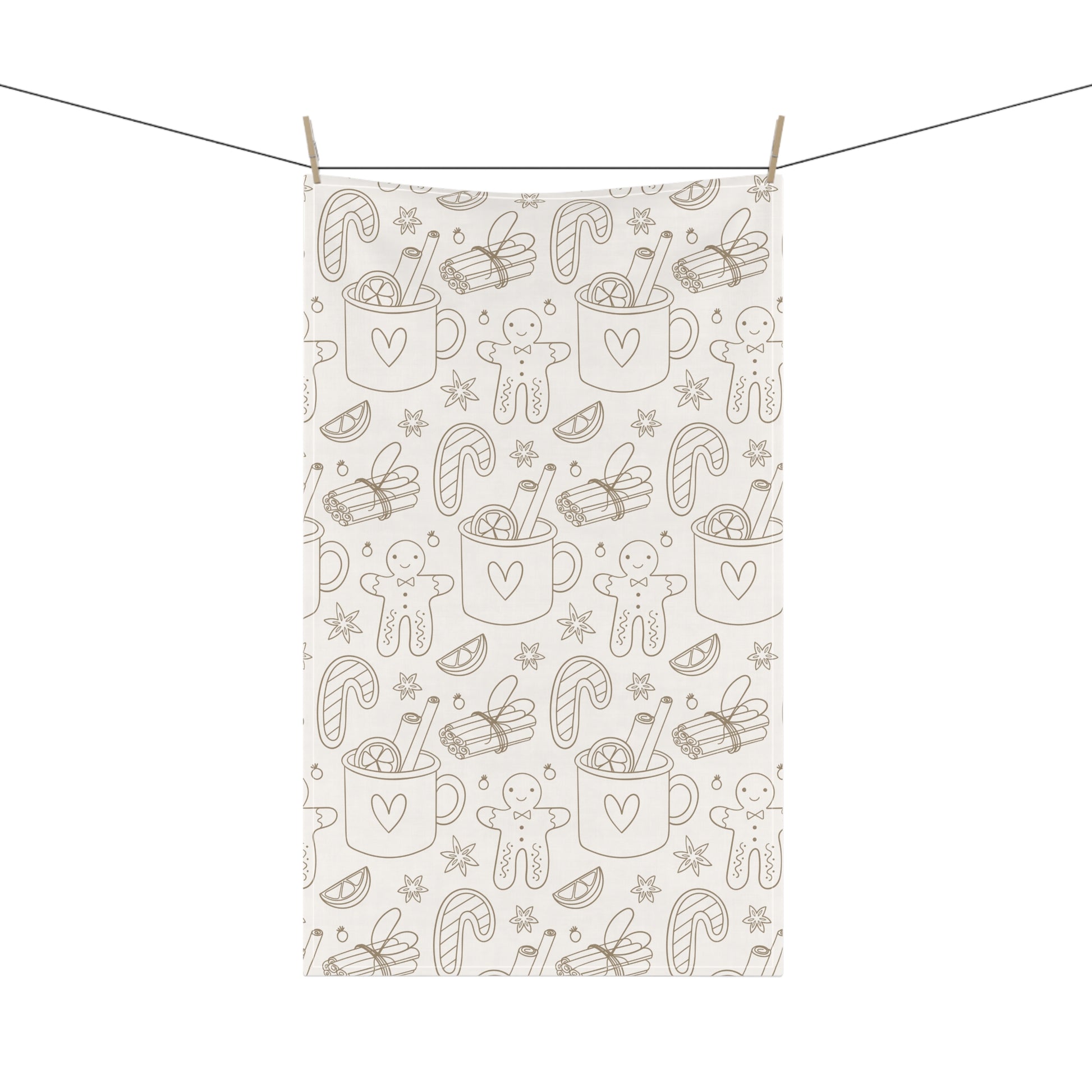 A cozy kitchen accent that brings warm, hand-drawn holiday charm into everyday moments. Lightweight and soft, this tea towel features a repeating sketch pattern of gingerbread figures, steaming mugs with heart motifs, candy canes, star cookies, and bundled cinnamon sticks—rendered in a neutral sepia line art on a cream background. It drapes easily over an oven handle or hangs on a peg, quietly adding a comforting, homey vibe while handling light kitchen tasks. The subtle palette and playful illustrations slip effortlessly into rustic, cottage, or Scandi-inspired spaces. Use it during cookie-baking sessions, casual cocoa nights, or to brighten a winter breakfast nook.