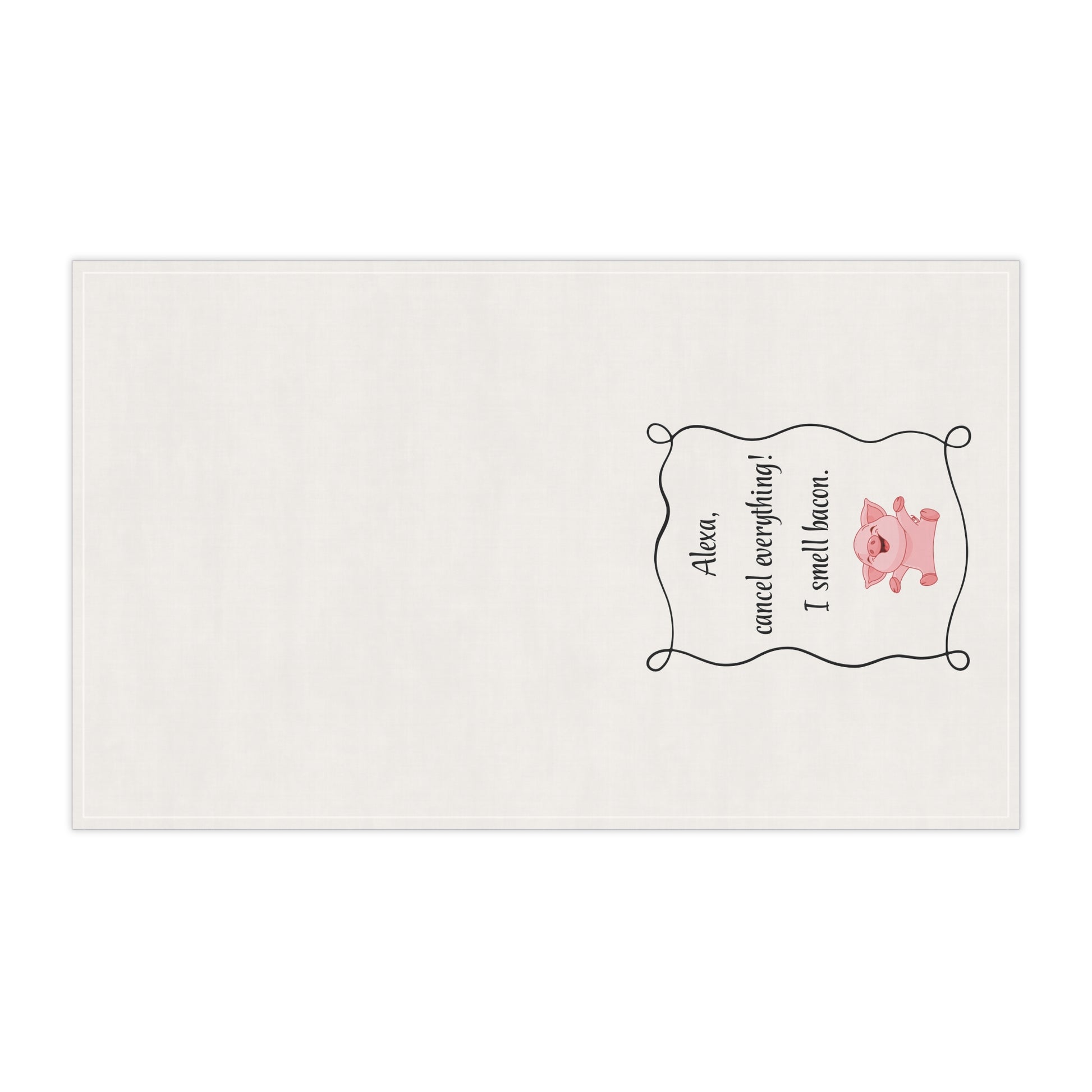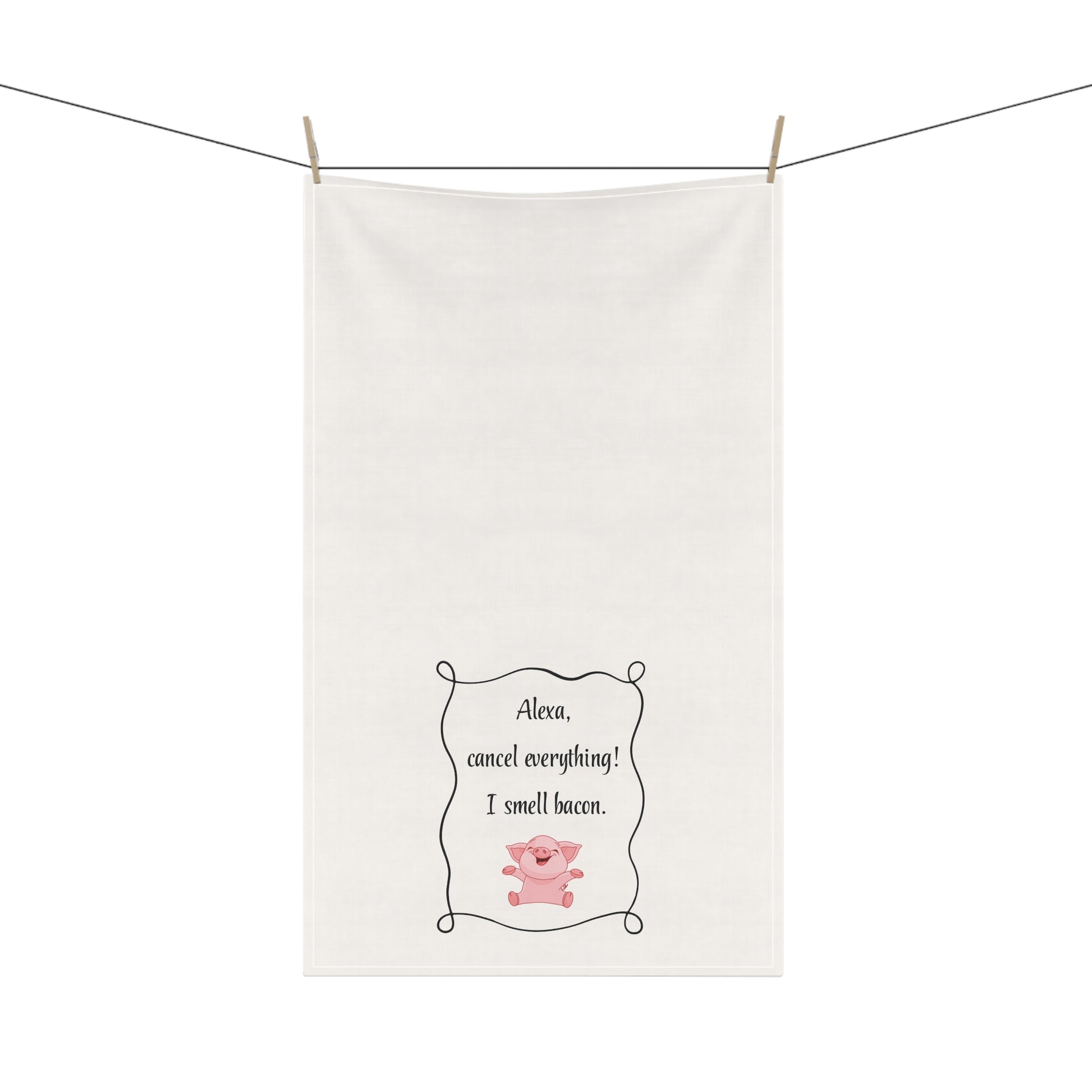 For the love of bacon! "Alexa, cancel everything. I smell bacon." Sass up your kitchen with this humorous tea towel that celebrates bacon. Our towels a splash of fun and personality to any kitchen. Made for anyone who loves to cook or bake, these towels are perfect for casual gatherings, holiday parties, or everyday use. Whether you're celebrating a birthday, hosting a family dinner, or simply enjoying a cozy evening at home, these tea towels are both stylish and functional. Their charming designs make them a wonderful gift idea for friends or family who appreciate a touch of country flair.