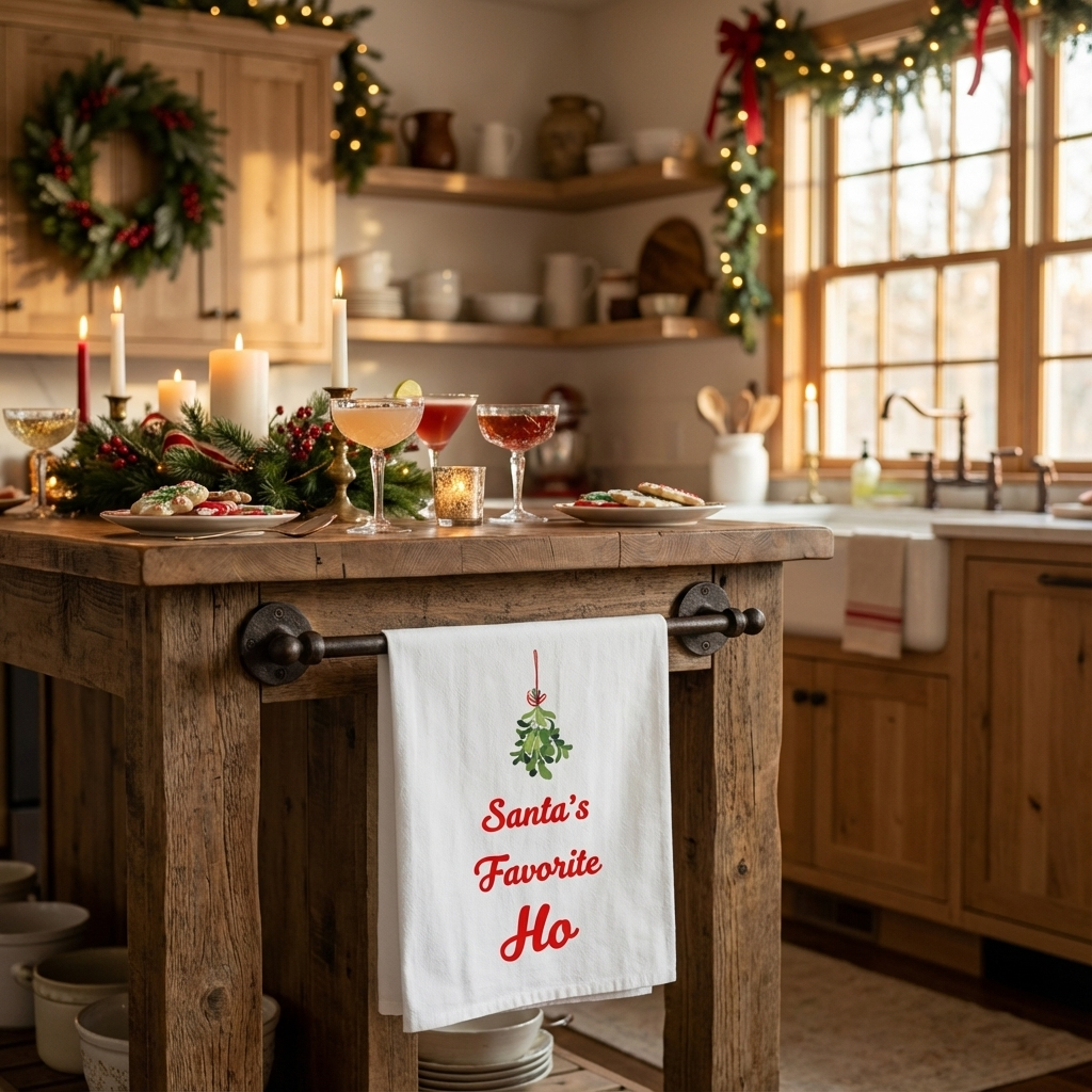 Soft, light, and a little naughty — this tea towel brings a wink to holiday prep. A sprig of mistletoe hangs near the top, and below in festive red script reads “Santa’s Favorite Ho.” The design sits low on the towel so it peeks out over an oven handle or dish rack, adding a playful note without overwhelming your kitchen. Choose breathable cotton twill for absorbency and a natural feel, or polyester for bright, long-lasting color. Use it on busy baking days, during cozy cookie swaps, or as a casual hostess touch when friends stop by for cocoa.