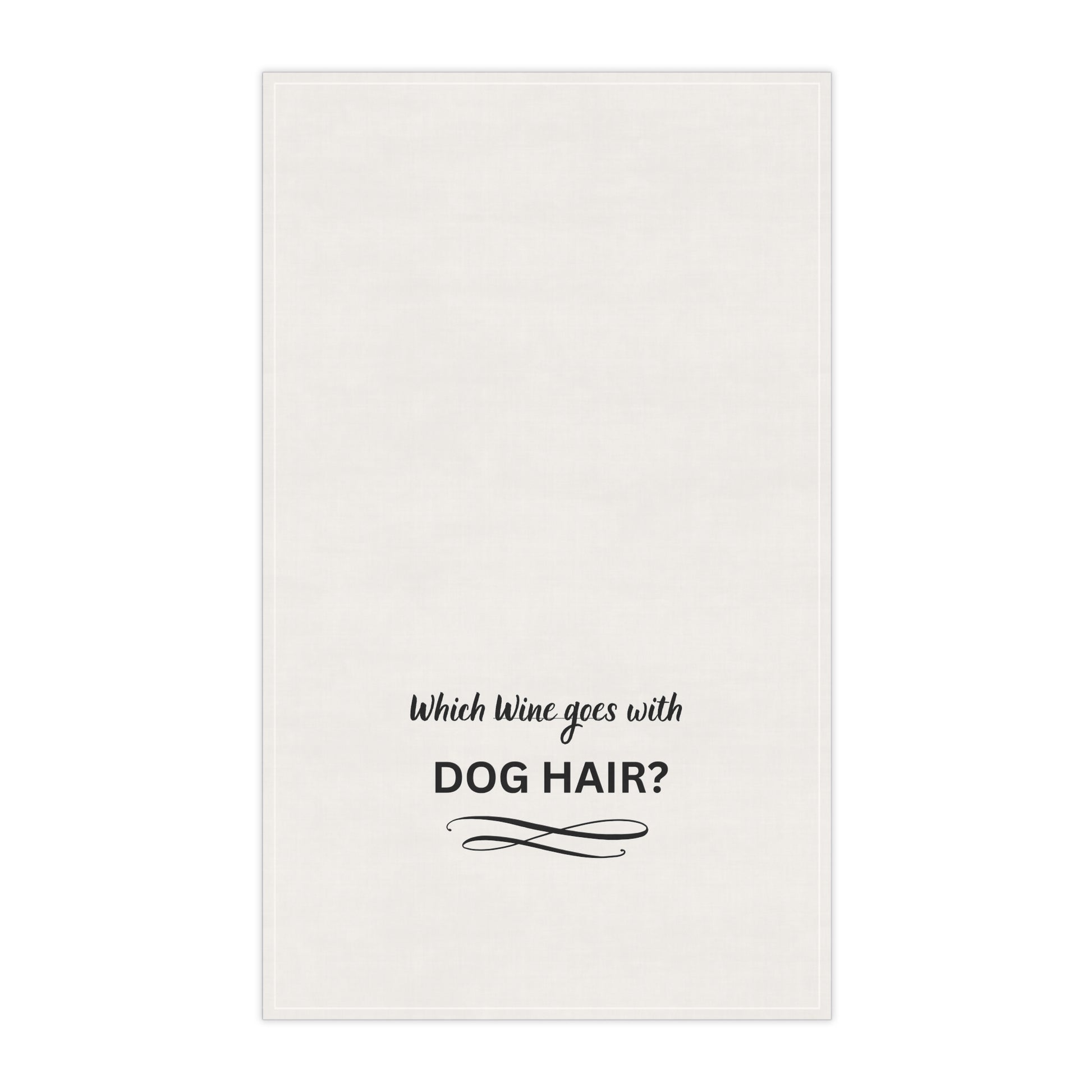 A lighthearted, useful tea towel that brings a smile to everyday kitchen moments. The soft, neutral fabric carries a witty black script that reads “Which wine goes with DOG HAIR?” — a small, sly nod to dog lovers who live with happy messes. Draped over an oven handle or folded on a counter, it reads like a private joke shared with guests. The simple, single-sided print keeps the design clean and easy to read, while hemmed edges give it a finished look. Choose durable polyester for vivid, long-lasting color or breathable cotton twill for extra absorbency. At 18" × 30", it’s the right size for quick cleanups, drying glassware, or adding a playful touch to your kitchen routine.